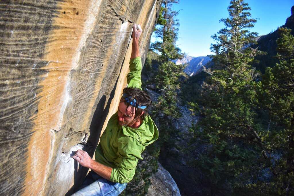 Person climbing a rock wall with natural light and plants in the foreground